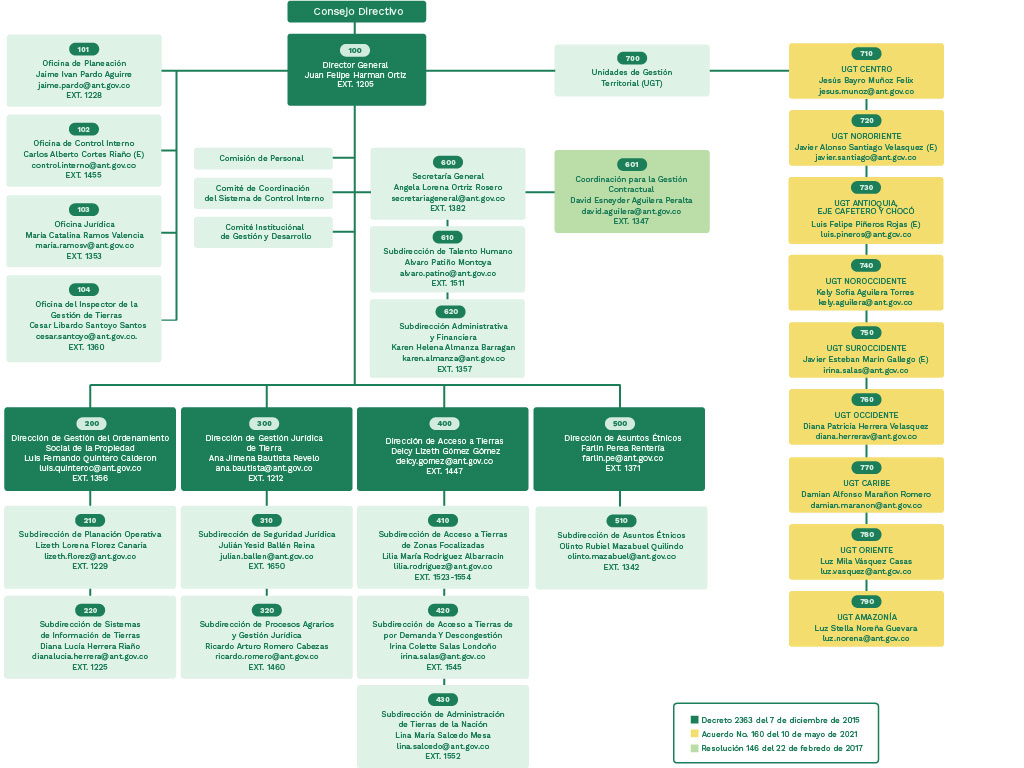 A continuación se presenta el organigrama de la Agencia Nacional de Tierras, de acuerdo con lo definido en el Decreto 2363 de 7 de diciembre de 2015, teniendo en cuenta las disposiciones del Capitulo II: ESTRUCTURA Y FUNCIONES DE LAS DEPENDENCIAS.